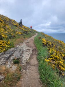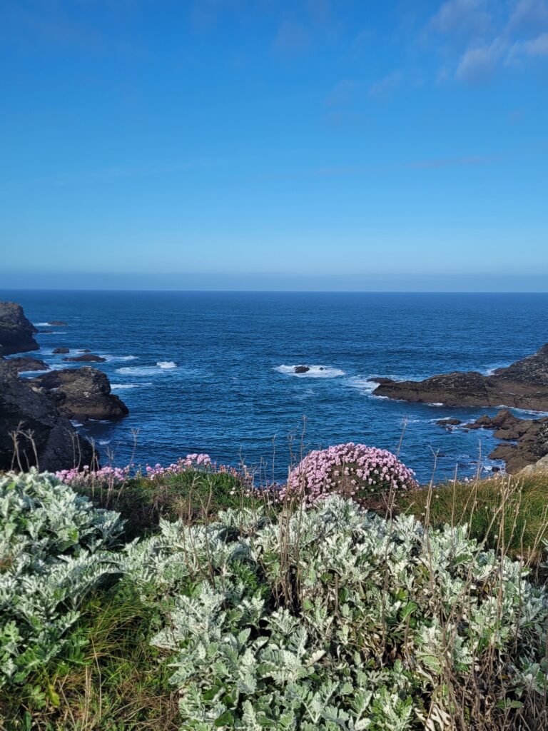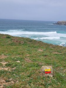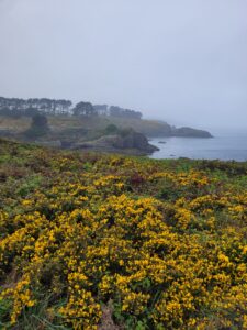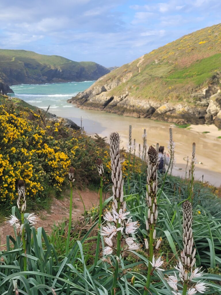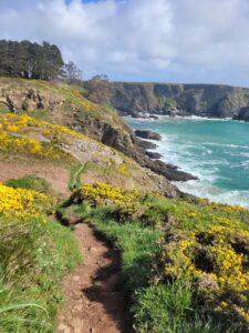 Sur les dunes de la plage de Donnant, aux rouleaux courus par les surfeurs, la variété de la végétation surprend. La discipline de protection de la flore prouve son efficacité : le sable du sentier est noyé de part et d’autre sous des mousses, des rosiers sauvages ras, aux fleurs blanches ou roses. Dans les herbes sèches, les immortelles, dépourvues de fleurs encore, restent discrètes. Seul leur parfum les trahit. L’apparition de celui de la glycine dans le sillage des odeurs de boue, d’algues, d’herbes ou d’aubépine, indique l’arrivée dans un des rares villages. On se retrouve alors à croiser ses semblables en grappes, au café pour une tasse de thé. Après la relative solitude de la transhumance en file indienne, les relations avec les humains — les autres et soi-même — se colorent d’étonnement.