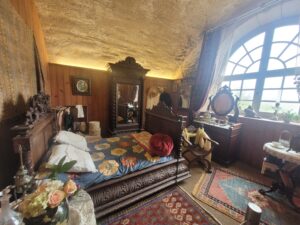 L’architecture militaire des siècles passés est détournée. Quelques fortins convertis en villa gardent désormais les hamacs du jardin. Le plus célèbre, à la pointe des Poulains, fut la propriété de Sarah Bernhardt, divine excentrique, artiste fabuleuse. Devenue musée, elle est meublée comme du temps de la grande dame. Nous nous hâtons de la visiter avant de prendre la navette. La fenêtre de sa chambre s’ouvre sur la côte déchiquetée et les tempêtes. Au fond de l’imposante cheminée de la salle à manger, s’affiche, dans le monogramme SB, sa devise « Quand même ». Je pose la main sur le granit de l’encadrement de la porte d’entrée, en espérant, par-dessus le siècle et le vent, toucher la main de Sarah. Et peut-être décider ma jeune pivoine, nommée d’après elle, à fleurir enfin.