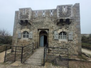Convoitée pour son eau douce, son emplacement stratégique et ses ressources, la côte de Belle-Île porte les stigmates de plusieurs phases de fortifications : la citadelle Vauban du Palais, les fortins, châteaux forts miniatures, avec meurtrières et pont-levis, les bunkers du Mur de l’Atlantique, dont les ramifications souterraines affleurent avec des trous d’observation et des escaliers plongeant dans le rocher sous le lierre. Difficile d’imaginer des bottes de soldats piétiner la beauté… Pourtant sa mission protectrice perdure : une base militaire en activité prévient sur son grillage qu’il est interdit de la photographier. Un hélicoptère manœuvre en bord de côte et, en vol stationnaire, largue sur un îlot, le long d’une corde, une douzaine de soldats, à raison d’un par seconde. Quelques minutes plus tard, il repart, la corde toujours pendue. Accrochés, espacés avec régularité, six soldats volent en grappe. Subjugués, nous le racontons à notre a fille qui, partie devant, ne l’a pas vu : « Whaou ! J’aimerais trop faire ça ! ». À l’aide !