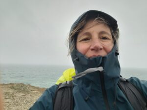 Les deux premiers jours tempétueux éprouvent notre coupe-vent et le nouveau poncho (celui des Baronnies, déchiré, a fini à la poubelle). Mes cheveux s’emmêlent en nid de pie et j’enfile un bonnet. Pour la suite du parcours, le soleil chasse les nuages, les combes chauffent et les visages rougissent. Le bras droit, cramé malgré la crème solaire, indique dans quel sens la randonneuse tourne autour de l’île.