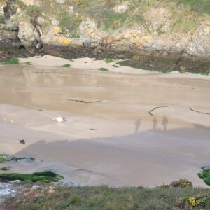 Une brume salée d’embruns s’envole et scintille dans le soleil. Le crachin semble à peine mouiller et soudain pourtant tout ce qui dépasse du coupe-vent est trempé. Après un pique-nique de taboulé et far aux pruneaux, je soulage mes pieds échauffés dans les vagues avec l’impression d’enfiler des chaussettes de glace, quand soudain la marée montante me prend de cours. Les vagues me chassent en riant. Le pantalon trempé séchera dans le vent.