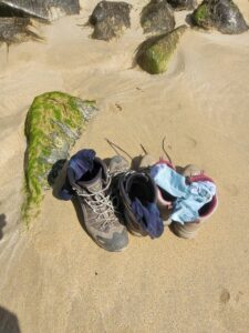 Ma cervelle avide de nature sauvage rejoue pourtant les codes sociaux : elle se compare. « Non, mais, combien elle a pris de pantalons de rando celle-là pour être toujours propre ? » J’en ai emporté deux, et forcément, avant que la vague ne le nettoie de force, le bas de mon premier pantalon, qui a essuyé la pluie, reste boueux le matin quand je l’enfile.