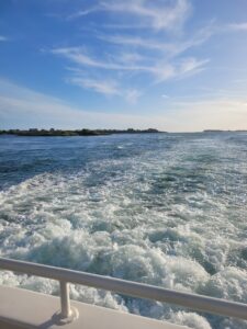 Jalouse de la tranquillité de nos vacances en famille, je redoute le « pot de colle » éventuel, l’individu qui, parti seul, mais ne l’assumant plus, déciderait de nous trouver bien sympathiques, nous attendrait le matin et s’adapterait à notre rythme, quelles que soient nos ruses pour mettre des heures et des pas entre lui et nous. Je suis soulagée lorsque, faute de place dans la salle commune, nous sommes installés pour le petit-déjeuner à une jolie table ronde en bois, dans la partie café de l’hôtel. Ça permet de converser – si l’humeur nous en dit – avec les dames de l’hôtel sans se voir imposer d’échanges. Cette table isolée, c’est ma sortie de secours. La navette vers le sentier, entièrement occupée, n’en a pas, mais je suis vite rassurée : sur cet éclat de terre, le trajet ne dure que quelques minutes. Chaque jour, nous commençons à marcher à 9 h 14.