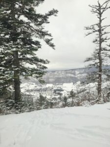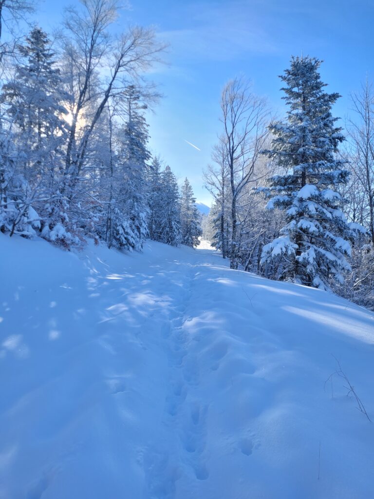 Le dimanche matin, sous un ciel éclatant de soleil et des sapins couverts de neige fraîche, nous sommes remontés en raquettes vers Combe Oursière, jusqu’au point de vue sur le plateau du Vercors.