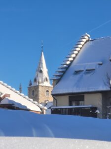 La nuit et les nuages couvent le centre du village. Derrière la fenêtre du café de l’hôtel nous observons la danse de la neige devant le clocher et les illuminations de Noël, dans la douceur brûlante d’un thé Earl Grey. La météo nous avait conditionné : avec le sale temps annoncé pour le week-end, vous ne pourrez faire qu’une brève balade. Nous avions négligé d’emporter un sac à dos, et avions très soif.
