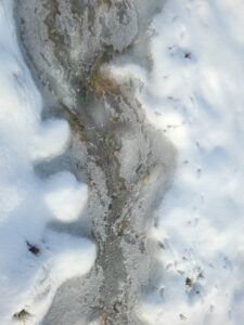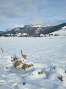 Mon dos m’embêtait en position assise ou couchée, mais me laissait crapahuter dans la neige fraîche, des flocons sur la langue. Sur le sentier qui monte au Moucherotte, nous n’avons croisé que deux hommes en ski de randonnée, et un couple, en raquettes comme nous. Ils ont poussé la porte de la cabane des Ramées avec leurs gros sac à dos nous laissant penser qu’ils vont y passer la nuit. Dans le jour obscurci, les flocons se font insistants. Nous rebroussons chemin.