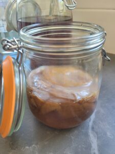 Bien sûr, j’ai abordé le kombucha comme toute autre préparation culinaire, avec enthousiasme, improvisation et approximations. Faute de disposer d’un bocal au diamètre adapté pour stocker les filles produites à chaque fermentation, je les laissais toutes ensemble. Ma boisson, devenue très acide, donnait l’impression d’avaler du vinaigre sucré et légèrement parfumé. Un passage à Avignon pour Pâques m’a permis de regoûter le parfum attendu de la boisson fermentée — peu acide — et de photographier la recette à nouveau. L’achat d’un bocal au bon diamètre me permettra de stocker les mamas dans leur hôtel (oui, c’est le nom) et d’éviter que ma boisson hebdomadaire soit suractivée par une famille nombreuse. Donc ce matin, j’ai sorti toutes mes méduses sur une assiette et, armée de deux fourchettes pour les préserver des bactéries, j’ai décomposé leur arbre généalogique avant de les ranger dans le bocal bas. Celui qui est dégueulasse.