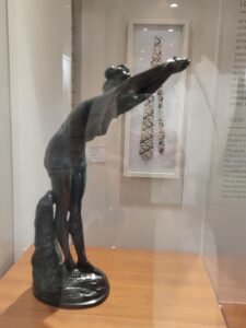 Une jeune femme nue en plâtre, grandeur nature sur un piédestal, brandit un miroir au-dessus de la tête. Sa main gauche, également levée, soutient un drapé dont les plis traînent au sol. Je me baisse pour arriver à lire son titre (avec les lunettes, oui) : La Vérité. Je m’exclame à haute voix, plus pour moi que pour mon amie à mes côtés, « Ah tiens, je ne savais pas ! L’allégorie de la déesse Vérité est un miroir ».