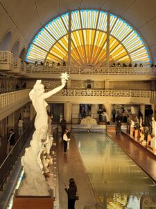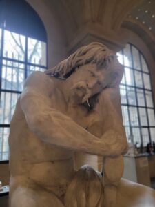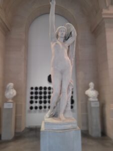 Avec l’intention de revoir une statue de Daphné se transformant en laurier, aperçue voilà de nombreuses années avant d’embarquer dans un autre TGV pour Lyon, je nous guide vers le hall du rez-de-chaussée consacré aux sculptures du XIXe siècle. Aucun bras-branche ne dépasse. La nymphe a dû être déplacée, rangée, prêtée. Entre des athlètes aux minuscules feuilles de vigne bombées qui me font marrer comme une gosse, une autre statue au bras en l’air attire mon œil.