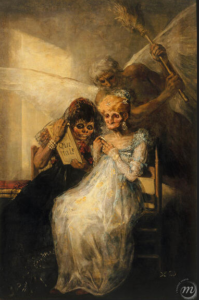 Hop, rechausser les lunettes pour lire les commentaires. Goya a peint là deux coquettes défraîchies dont les traits et les corps émaciés, sous des robes à volants, évoquent le monde des morts de Coco de Pixar, l’air de guitare en moins. Assise, l’aristocrate édentée habillée de clair tient un petit objet, qui pourrait être un portrait d’elle dans sa jeunesse. À ses côtés, sa servante en mantille aux yeux creusés de squelette, lui présente un miroir au dos duquel est inscrit « Qué tal ? », « Comment ça va ? ». (Pourquoi Goya a-t-il omis le point d’interrogation à l’envers au début de la phrase ?) Derrière elles, un homme barbu et ailé, Chronos, le dieu du Temps, brandit un balai, avec lequel on soupçonne qu’il s’apprête à les réduire en poussière. Ce tableau s’intitule Les vieilles ou Le Temps. Lui aussi aurait pu être baptisé La Vérité.